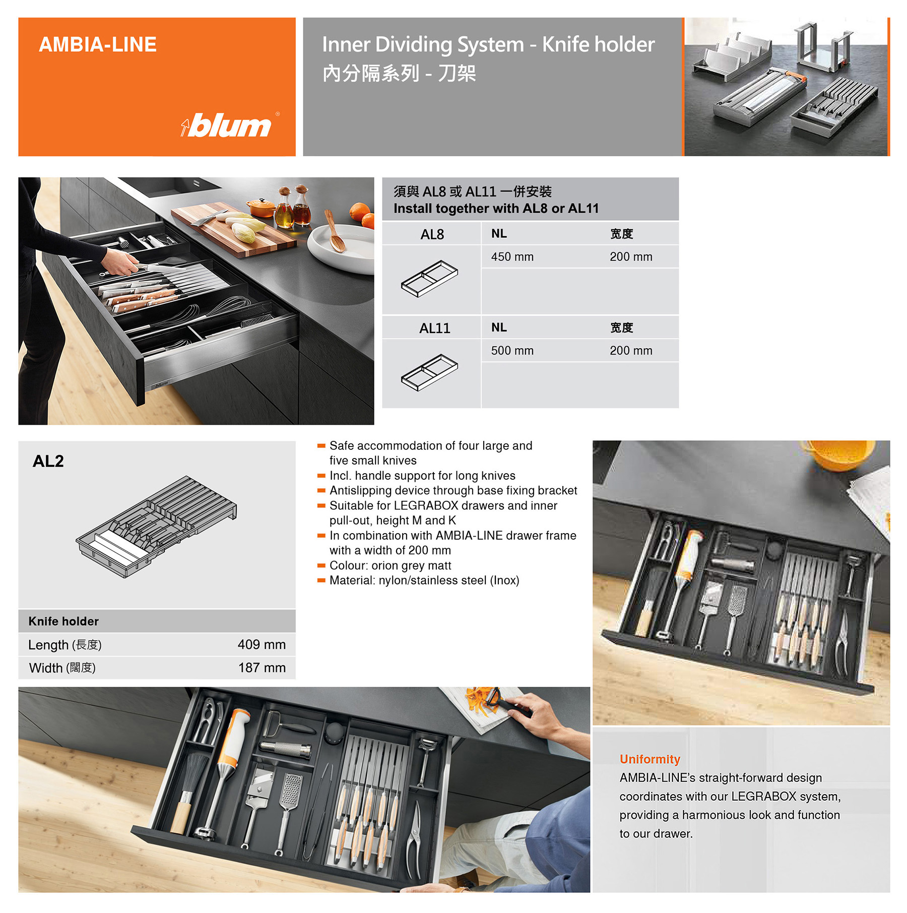 主頁五金配件(Hardware)櫃桶路軌"金屬"側板櫃桶路軌AMBIA-LINE 內分隔系列 AL2 - Knife holder (刀架)