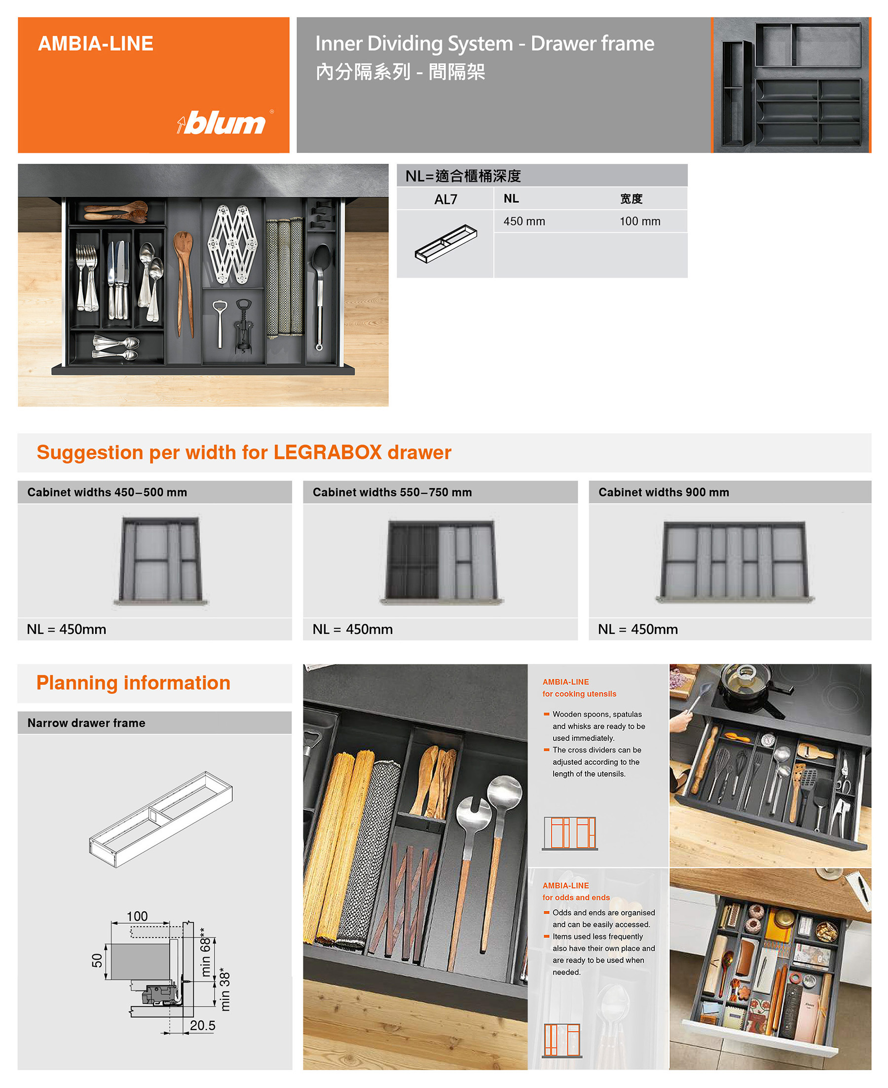 主頁五金配件(Hardware)櫃桶路軌"金屬"側板櫃桶路軌AMBIA-LINE 內分隔系列 AL7 - 100mm Drawer frame (間隔架) - 450mm