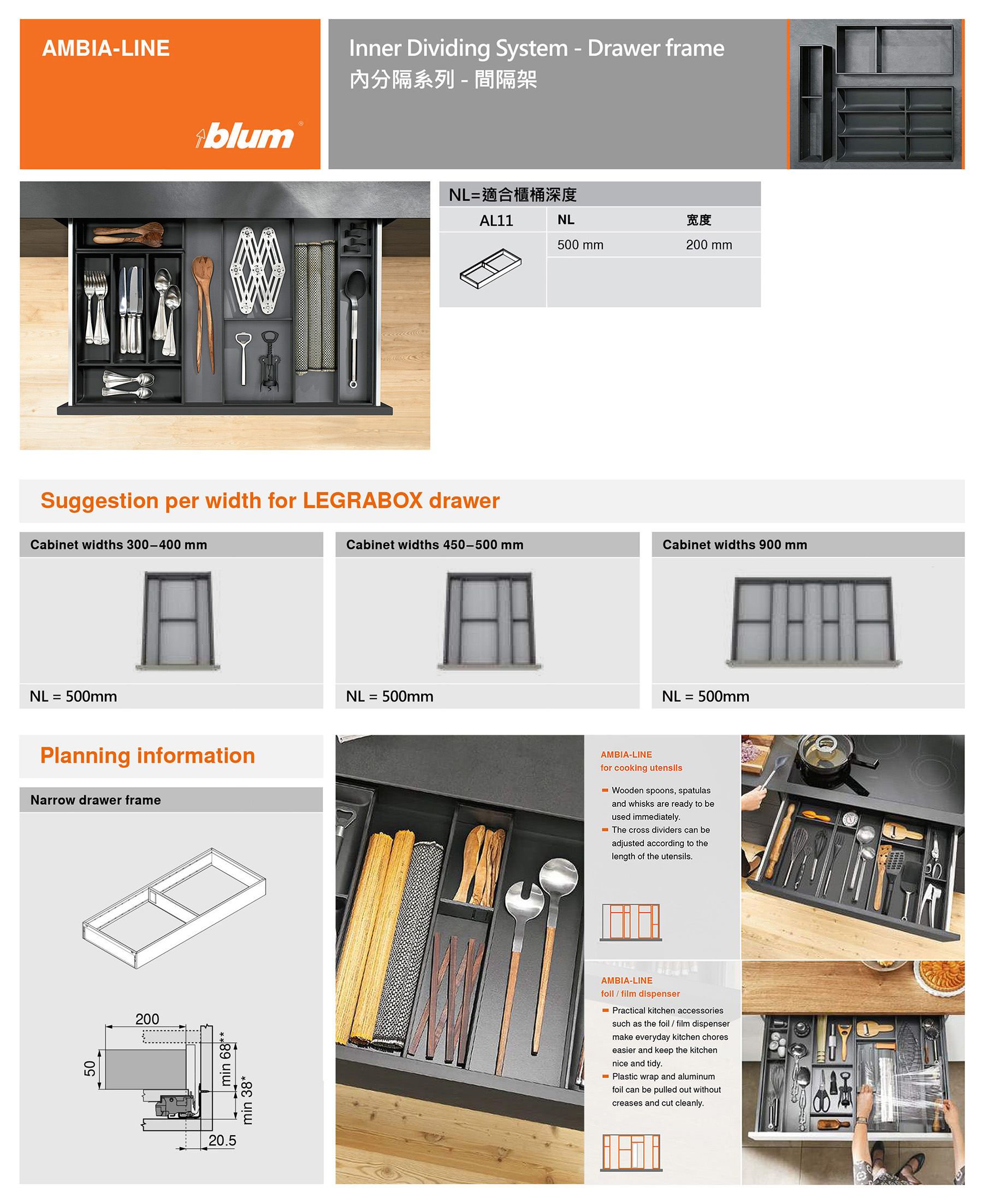 主頁五金配件(Hardware)櫃桶路軌"金屬"側板櫃桶路軌AMBIA-LINE 內分隔系列 AL11 - 200mm Drawer frame (間隔架) - 500mm