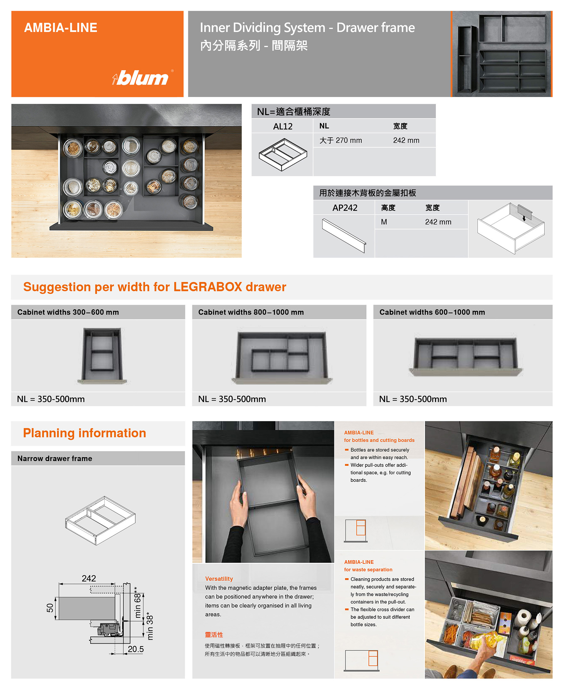 主頁五金配件(Hardware)櫃桶路軌"金屬"側板櫃桶路軌AMBIA-LINE 內分隔系列 AL12 - Drawer frame (間隔架) - H50mm