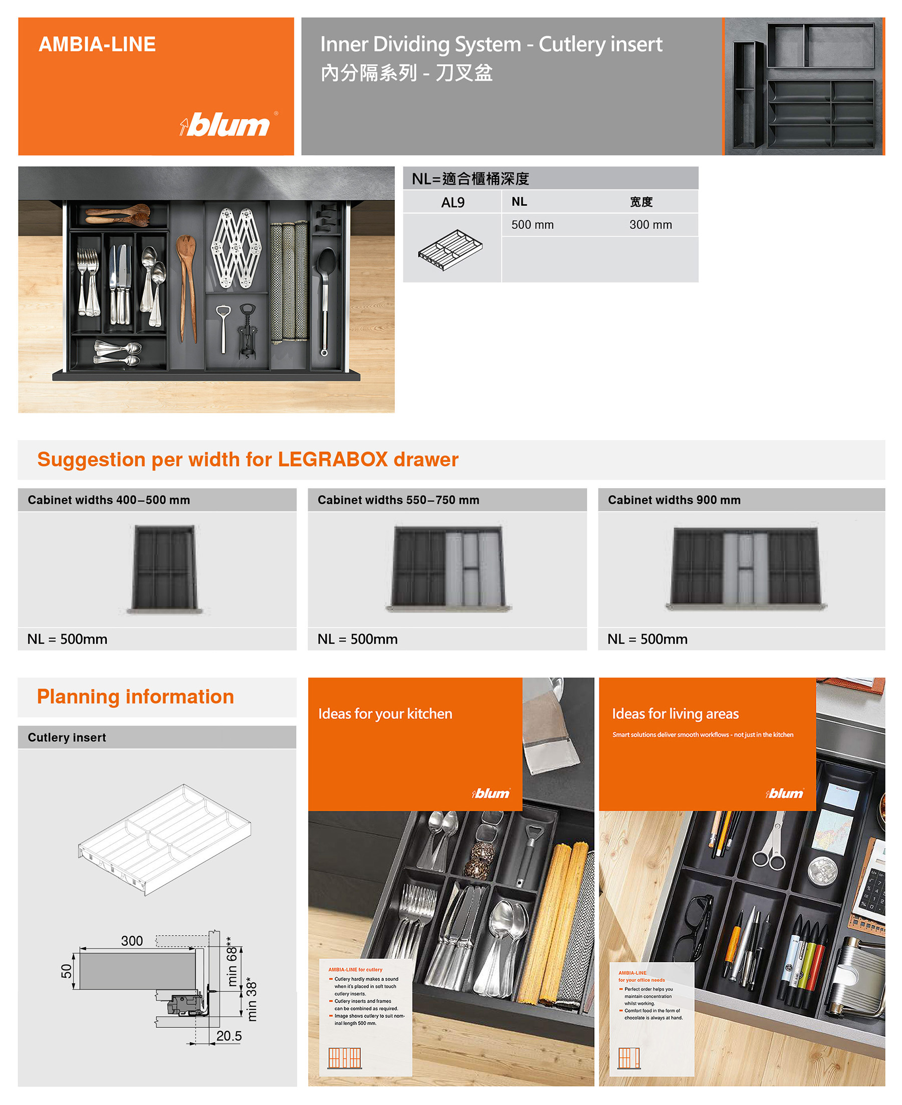 主頁五金配件(Hardware)櫃桶路軌"金屬"側板櫃桶路軌AMBIA-LINE 內分隔系列 AL9 - Cutlery insert (刀叉盆) - 500mm