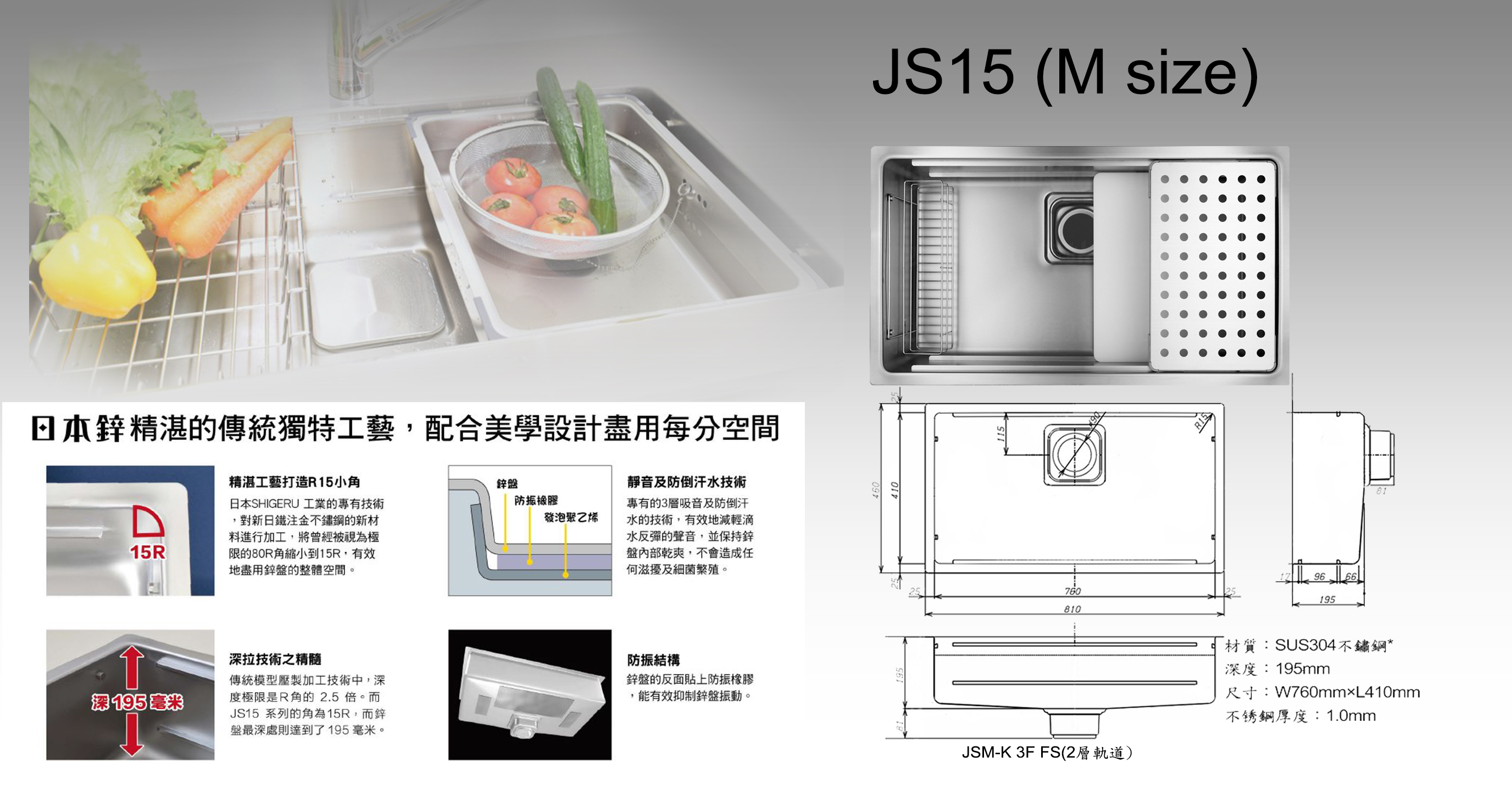 JS15 單鋅盆 JSM-K 3F FS - 不銹鋼 (2層軌道)
